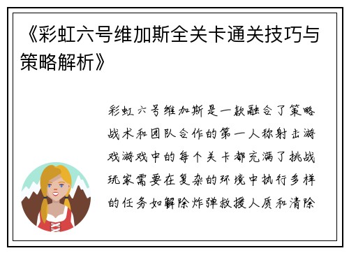 《彩虹六号维加斯》是一款融合了策略、战术和团队合作的第一人称射击游戏。游戏中的每个关卡都充满了挑战,玩家需要在复杂的环境中执行多样的任务,如解除炸弹、救援人质和清除恐怖分子。本文将通过四个方面对《彩虹六号维加斯》的全关卡通关技巧与策略进行详细解析,帮助玩家提升游戏技巧,顺利通过各类关卡。